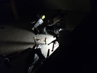 (Notes: Not wholly pleased with how this little pic-story turned out. I decided to take the pics in a different part of the house to add some location variety and establish that, yes, this is all happening far away from where we were in the last 'Further Adventures...' post. Unfortunately it was a bugger to keep the light balance right, especially in the shots at the mystery sniper's perch - the main light in the room was broken at the time and I had to hang a desk lamp above the scene, hence everything in the last two shots 'blooming' all to hell.